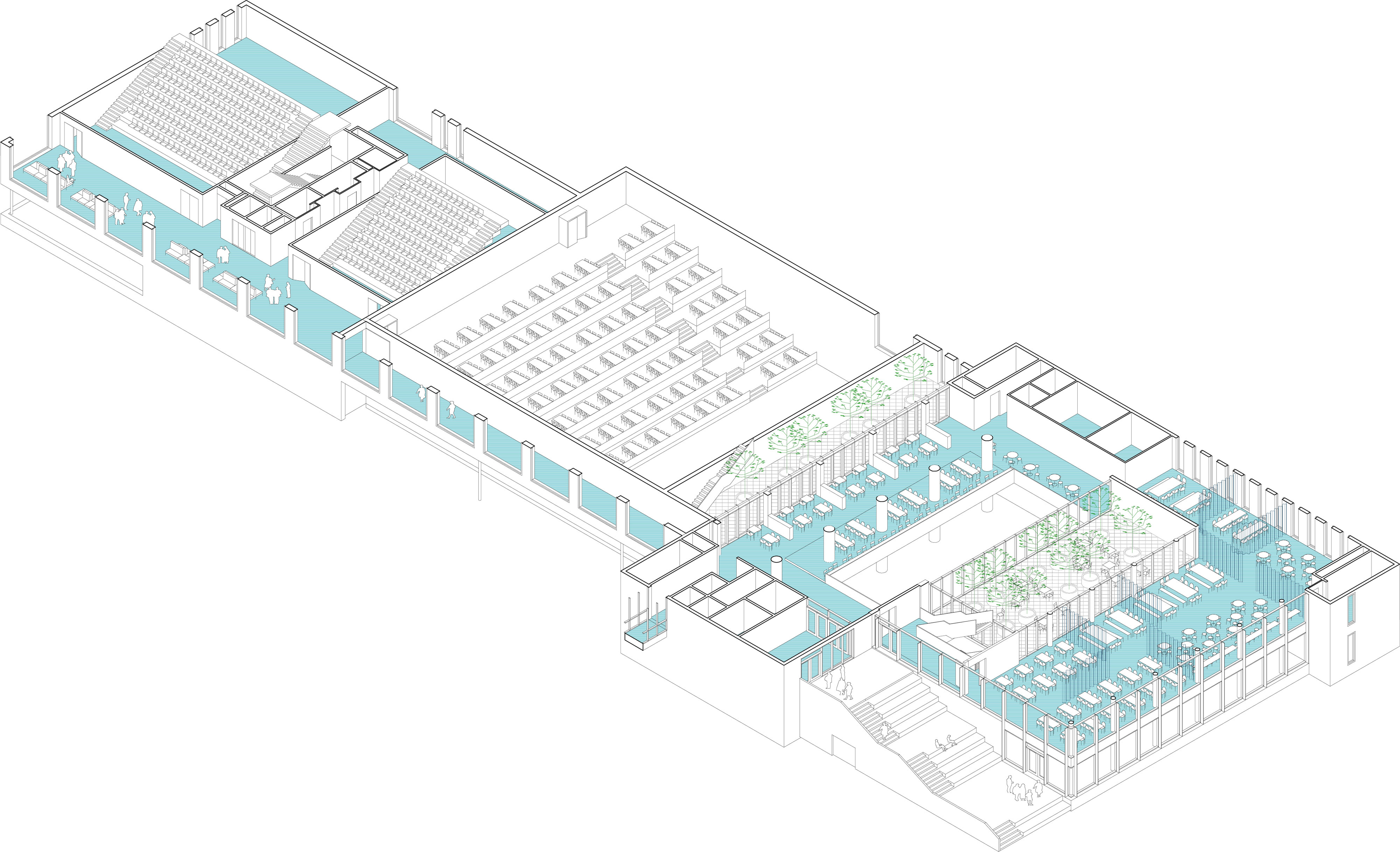 Dit schetsontwerp, gemaakt voor de wedstrijd, is een eerste ruimtelijke vertaling van het bouwprogramma en geeft onze visie op de opdracht weer, waarbij we Campus De Vest beschouwen als de centrale hub en het uithangbord van de Thomas More hogeschool in Mechelen.