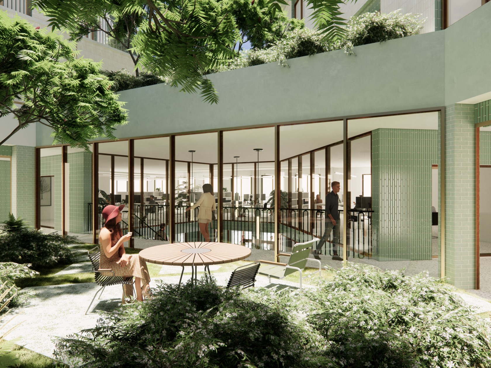 Terwijl het bestaande achterliggend binnengebied is dichtgebouwd met koterijen, creëert Petit Paris groene, kwalitatieve ademruimte. De groenzone is niet enkel een verbindend element aan de buitenzijde van het gebouw, maar ook binnenin wordt er een relatie gelegd tussen het binnengebied van het project en het publieke plein langs de Koninginnelaan. Een transparante plint met dubbelhoge foyer binnenin maakt de (visuele) verbinding mogelijk tussen de publieke ruimte en de semi-publieke patio op de eerste verdieping van het project.